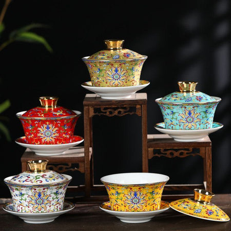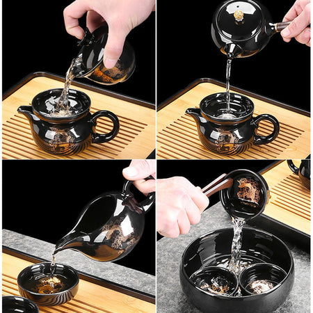 This high-end Chinese-style gilded Vietnamese sand gold tea set includes 1 tray, 1 pot and 4 cups. The tea cups are treated with a...